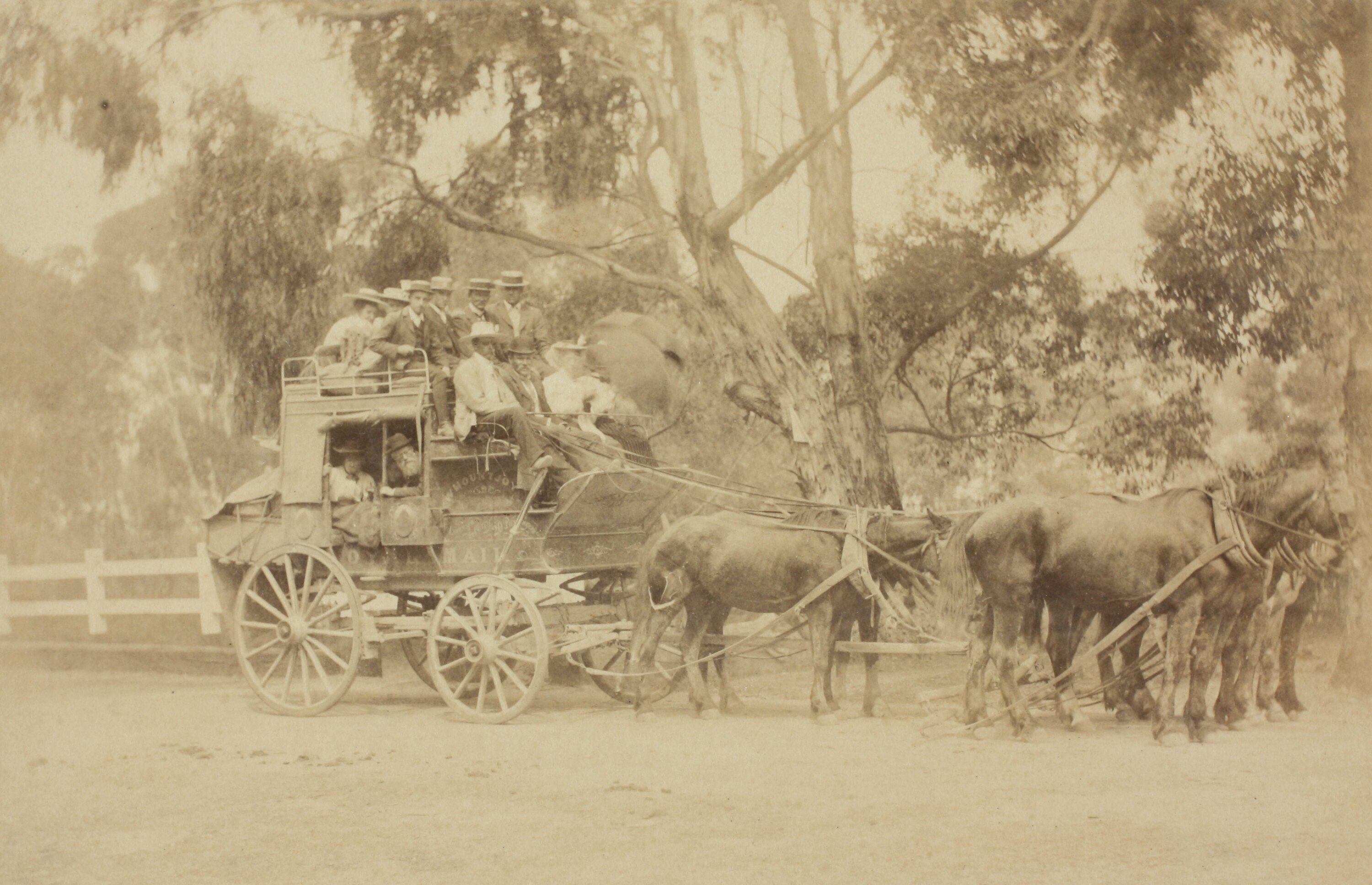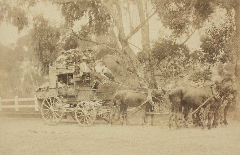 Black and white image of W. Mountjoy's horse drawn coach, with people sitting on roof of coach and inside coach. It was taken at Erskine River, Lorne, Victoria in the 1890s.