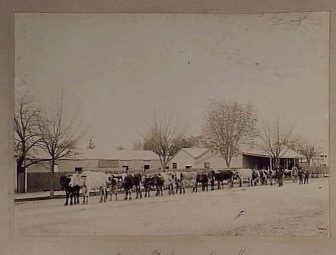 Bullock team in front of township.