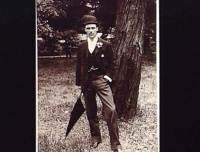 Dandy man posing with folded umbrella. (possibly Dept of Mines employee).