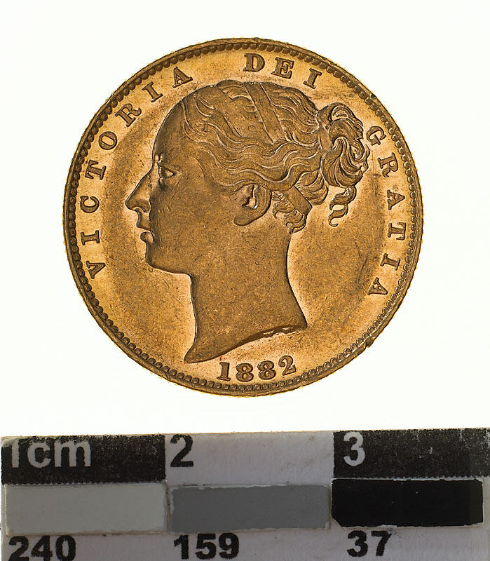 A gold coin (21.5 mm diameter with milled edge) featuring a head of Queen Victoria facing left with a plain band and fillet in her hair, the date, 1882; the artist's initials, W.W., in raised letters on neck truncation; around, VICTORIA DEI GRATIA. The reverse features the royal shield of arms, garnished and crowned with the mint mark M below the crossing point of the wreath and above the rose; around, BRITANNIARUM REGINA FID: DEF:
