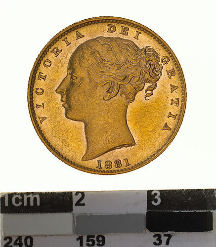 A gold coin (21.5 mm diameter with milled edge) featuring a head of Queen Victoria facing left with a plain band and fillet in her hair, the date, 1881; the artist's initials, W.W., in raised letters on neck truncation; around, VICTORIA DEI GRATIA. The reverse features the royal shield of arms, garnished and crowned with the mint mark M below the crossing point of the wreath and above the rose; around, BRITANNIARUM REGINA FID: DEF: