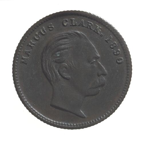Milled (edge) MARCUS CLARK. 1890 Marcus Clark, bare head r. (obverse) THE GREAT SOUTHERN DRAPER/NEWTOWN/SYDNEY/N.S.W/B & R LONDON (reverse)
