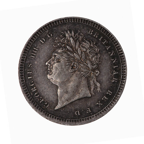 Laureate head of the King facing left; around, GEORGIUS IIII D. G. BRITANNIAR. REX F. D.