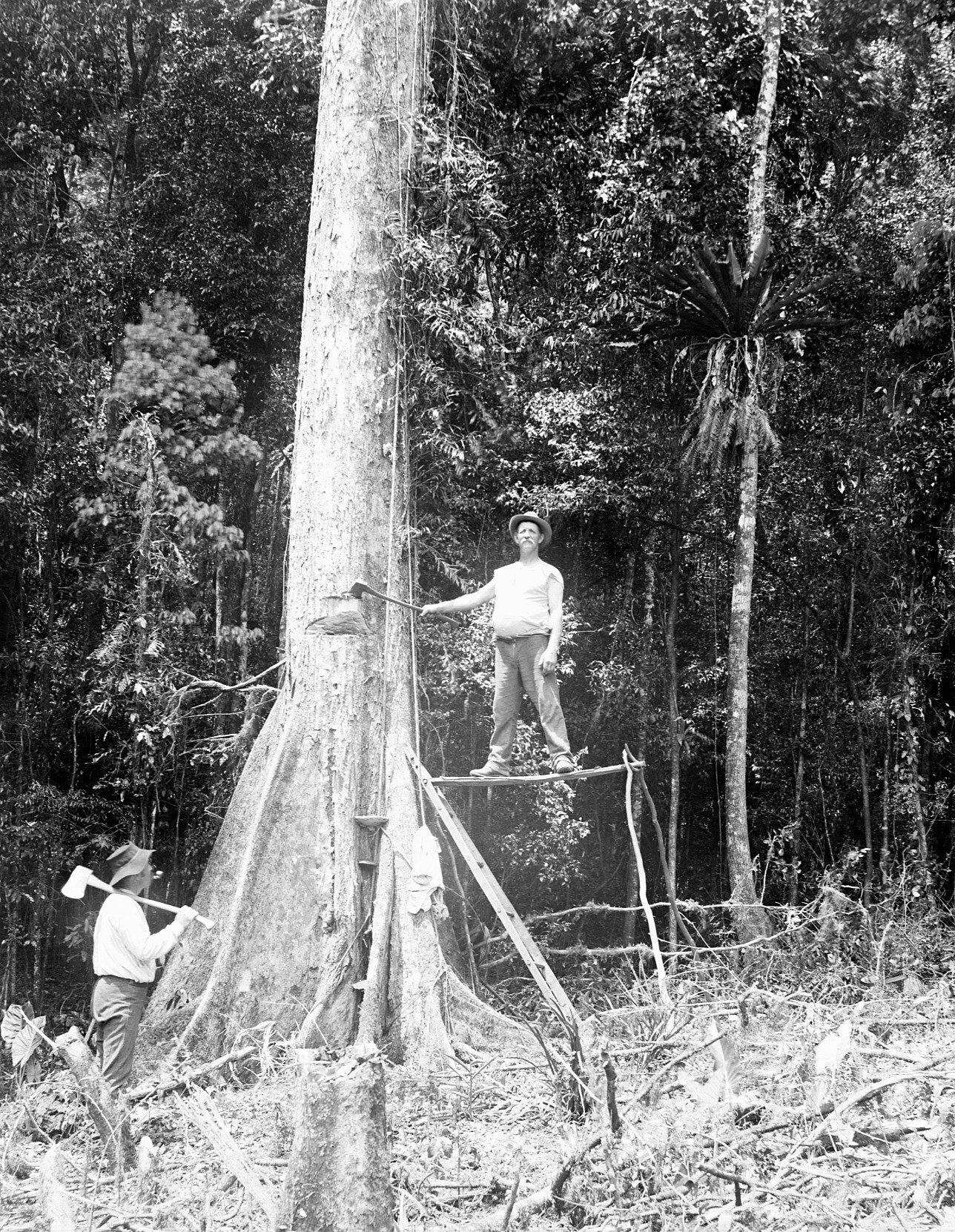 Two men felling a forest tree. One man is standing on a plank inserted in the tree and has his axe buried in the tree. The other man stands beside the tree with his axe on his shoulder.