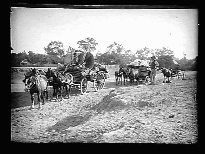 Two horse-drawn wagons loaded with household goods, including a water tank. One man is seated on his wagon while another stands beside the second wagon. In the background is a buggy driven by a woman,.