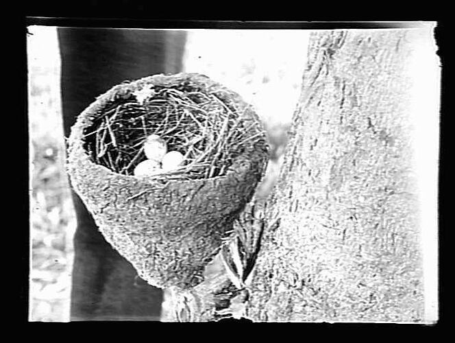 Mud nest of the white-rumped wood swallow with old grallina 's nest Three eggs are visible.