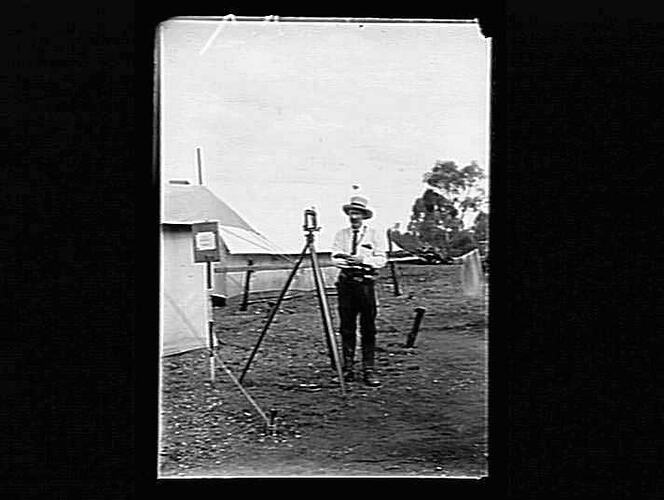 Surveyor with theodolite; small sign on staff by tent reads 'For Hamia or Ray'.