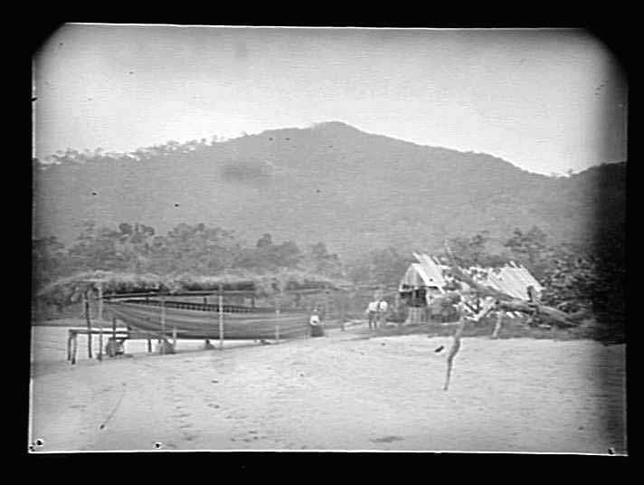 Boatshed with boat, house in background, on Queensland shore.