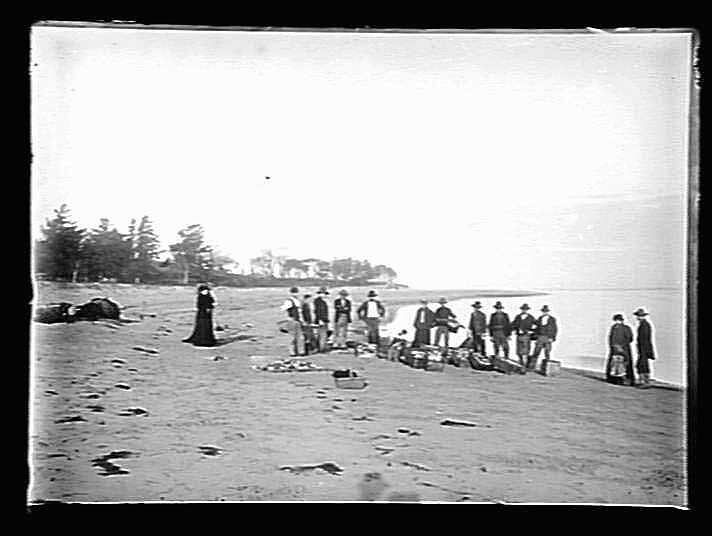 14 people on beach; boxes of fish.