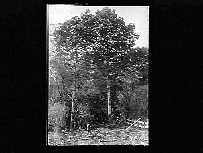A man beneath two large acacia trees.