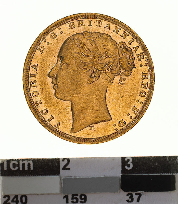 A gold coin (21.5 mm diameter with milled edge) featuring a young head of Queen Victoria facing to left, with a plain band and fillet around hair. The mint mark M below; around, VICTORIA D:G: BRITANNIAR: REG: F:D: The artist's initials W.W. partly visible on the truncation of the neck.The reverse features St. George on horseback holding short sword, the horse rearing to right over a fallen dragon which has a broken lance in its chest; in exergue, the date, 1875 and the artist's initials B.P.