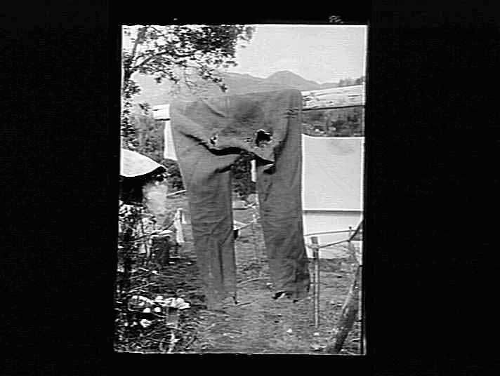 Worn out pair of trousers hanging on post.