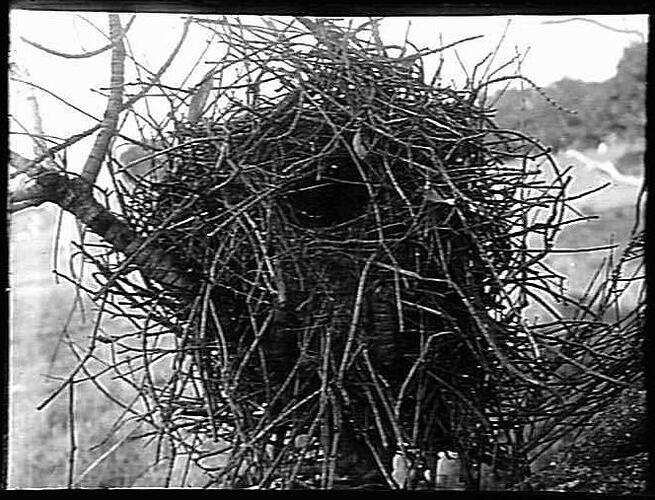 Image taken by A.J. Campbell in preparation for his definitive work, 'Nests and Eggs of Australian Birds including the Geographical Distribution of the Species and Popular Observations Thereon', published by Pawson & Brailsford, Sheffield, England in 1900. The image was used to illustrate the nest of the species, and Campbell noted: 'Similar to that of P. temporalis, but proportionally smaller; bulky, dome-shaped, with hooded side entrance; constructed of sticks; lined inside with such soft materials as portions of flowers, feathers, grass, bark and wool. Usually placed in a low tree or bush.'