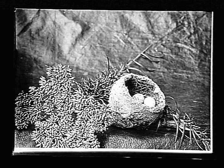 Nest like collection no 819 (strong bowl shaped nest containing 5 eggs from acacia) from cassinia or orothamnus shrubs.