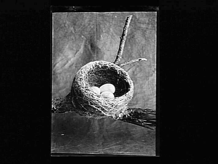 Image taken by A.J. Campbell in preparation for his definitive work, 'Nests and Eggs of Australian Birds including the Geographical Distribution of the Species and Popular Observations Thereon', published by Pawson & Brailsford, Sheffield, England in 1900. This particular image was featured as Plate 8, where Campbell notes 'Nest - Cup-shaped, neat and symmetrical, with narrow but well-built sides, composed of dried grass or fine shreds of bark, felted outwardly with spiders' webs, some of the webs being worked round and underneath the fork or branch on which the nest is placed; lined inside with finer grass, a few fibrous rootlets, feathers, hair, &c., and usually situated on the dead portion of a low horizontal branch a few feet from the ground, more frequently above water. Dimensions over all, 2 ¥ inches by 1 ¥ inches in depth; egg cavity, 2 ¢ inches across by 1 ¢ inches deep.'