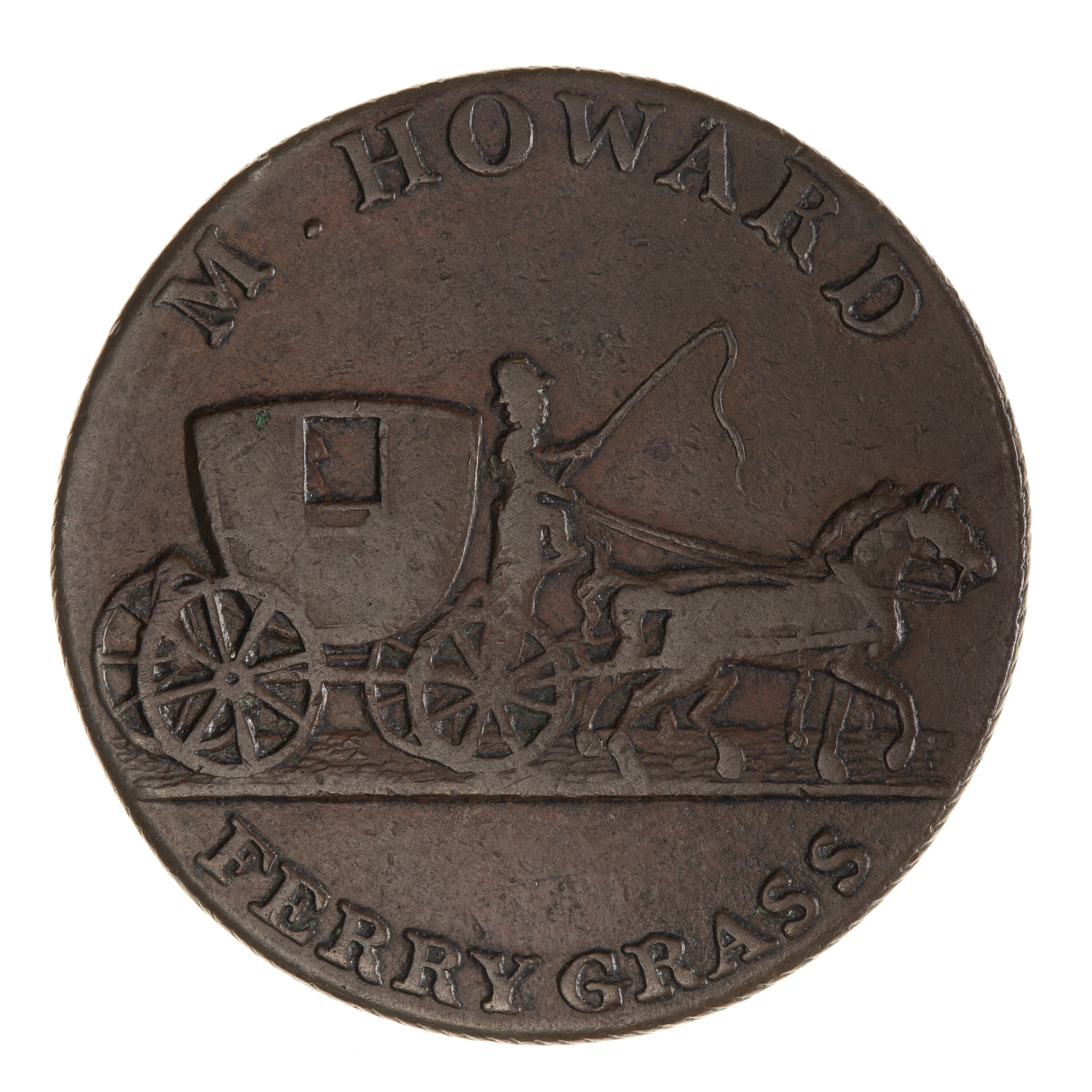 A coach with two horses being driven by a coachman to right; above, M. HOWARD; in exergue, FERRY GRASS