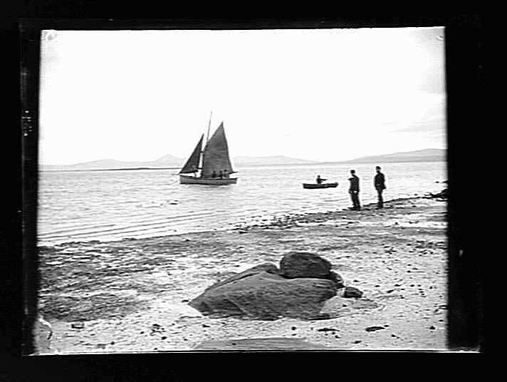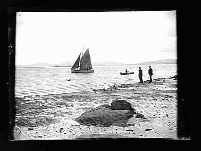 Boat offshore men on beach.