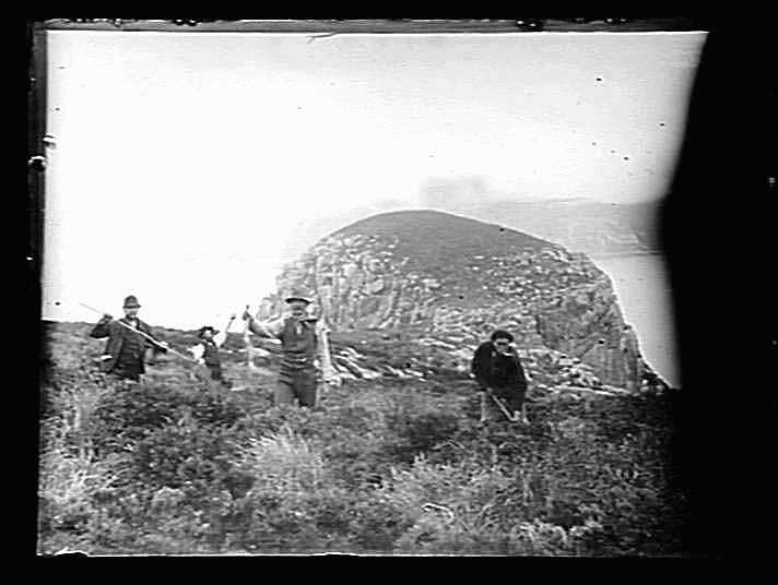 Four men on Kent Island one with a snake possibly a tiger snake.