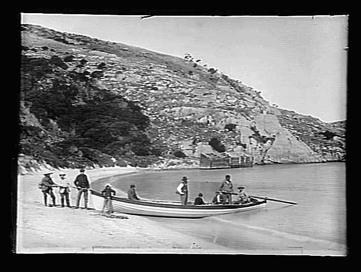A long boat on one side of the shore, a wreck on the other side (Kent Island Group).