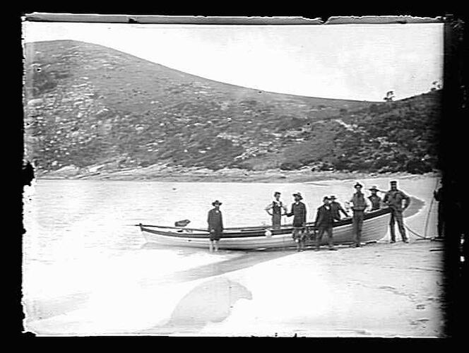 Long boat on the shore a view from the other side refer collection no 849 (long boat on one side of the shore, a wreck on the other side Kent Island Group).