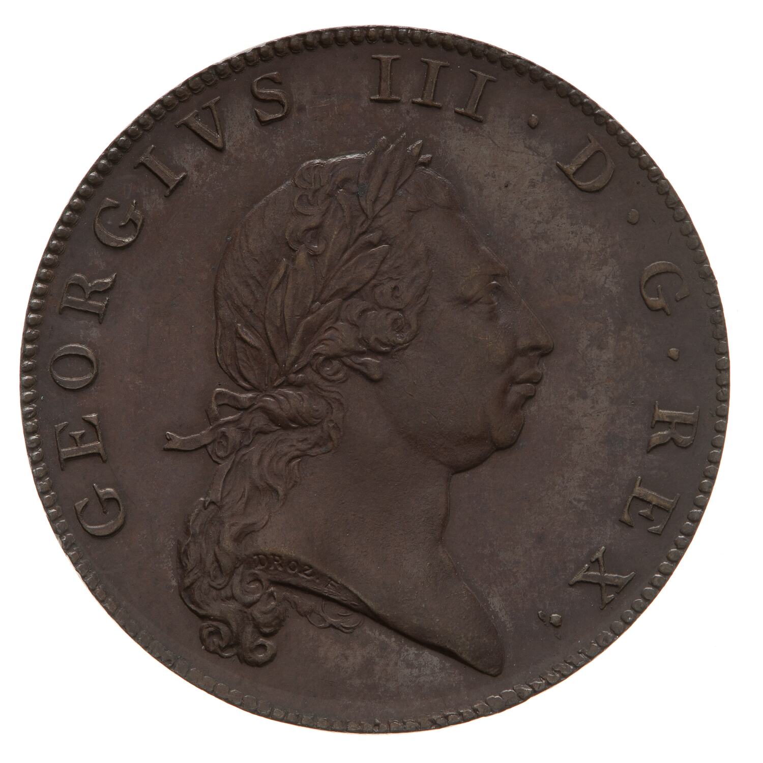 Lauteate bust of the King facing right; DROZ F on neck truncation; around, GEORGIVS III D G REX
