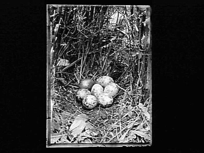 Image taken by A.J. Campbell in preparation for his definitive work, 'Nests and Eggs of Australian Birds including the Geographical Distribution of the Species and Popular Observations Thereon', published by Pawson & Brailsford, Sheffield, England in 1900. This image featured as plate 17. Of the nest Campbell noted 'Upon the ground in crop or herbage, the nesting hollow, 4-1/2 inches across, being lined with straw or grass as the case may be.' of the Eggs he observed ' Clutch seven to eleven or twelve, rare instances maximum fourteen; roundish oval in shape ; texture somewhat coarse; surface glossy; colour, dirty-yellow, heavily blotched and smudged with dark olive green. Dimensions in inches of a proper clutch; (1) 1.27 x .91, (2) 1.27 x .9, (3) 1.25 x .93, (4) 1.25 x .88, (5) 1.22 x .91, (6) 1.22 x .92, (7) 1.19 x .88.'