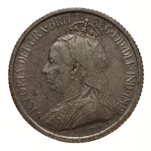 Crowned bust of Victoria left; around, VICTORIA DEI GRA BRITT REG FID DEF IND IMP