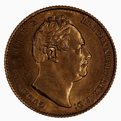 Bare head of the King facing right; the artist's initials W.W. (William Wyon) incuse on neck; around, GULIELMUS IIII D:G: BRITANNIAR: REX F:D:. Second head, the tip of the King's nose adjacent to the second I of BRITANNIAR.