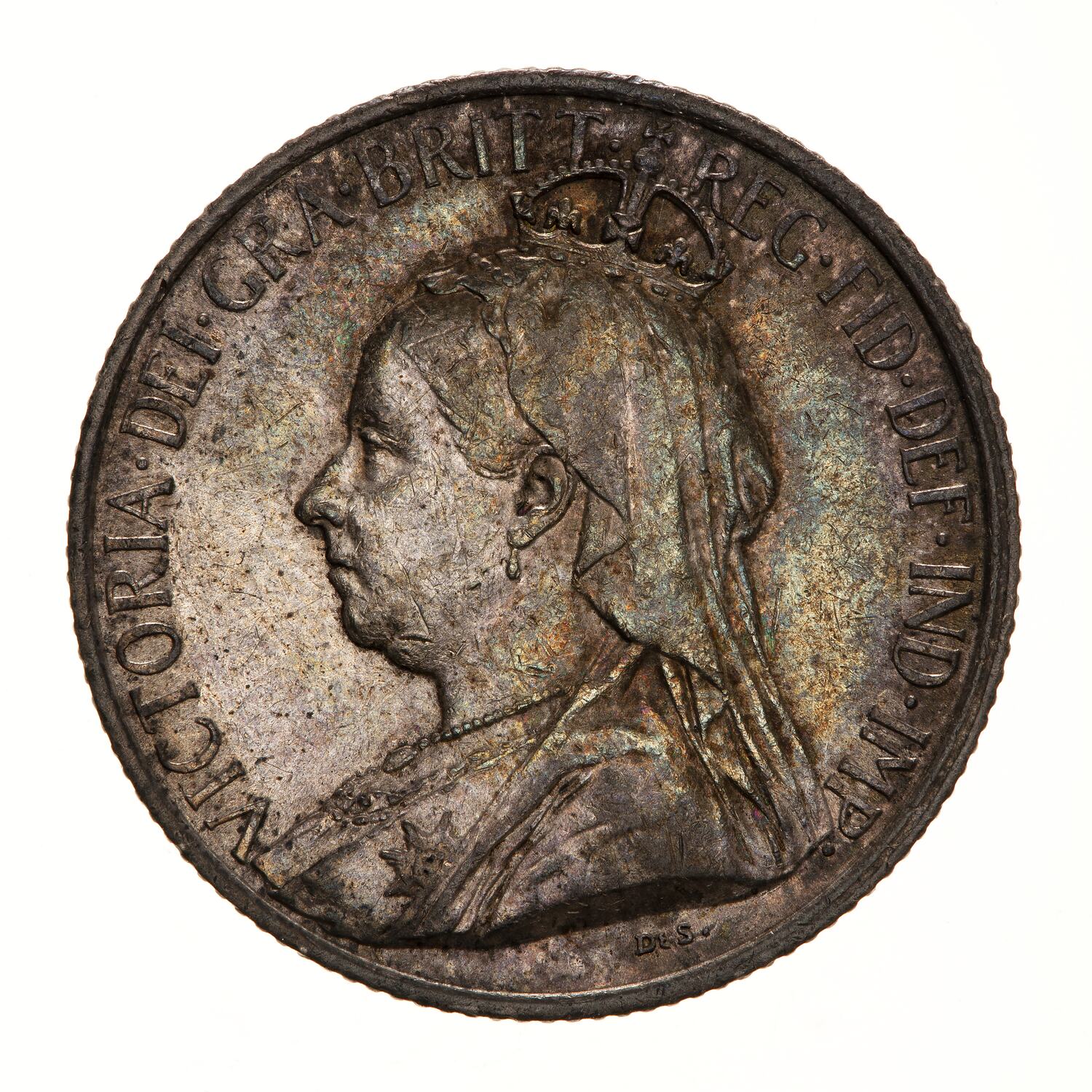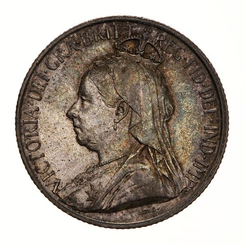 Crowned bust of Victoria left; around, VICTORIA DEI GRA BRITT REG FID DEF IND IMP