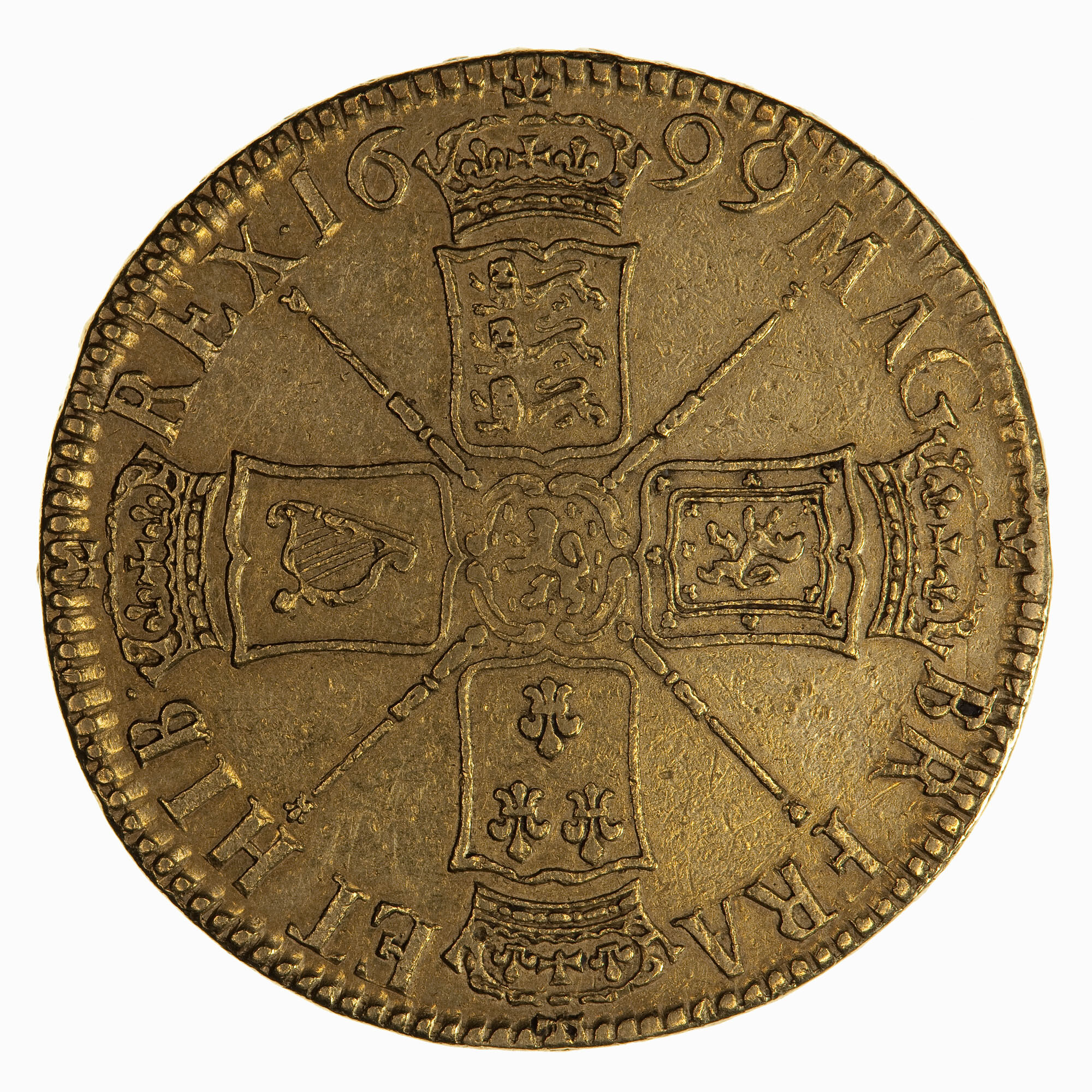 Crowned shields of England, Scotland, Ireland and France forming a cross shape, with the arms of the House Nassau at the centre. In the angles between the shields are four sceptres with different heads, an orb, a thistle, a lis and a harp; around, MAG. BR. FRA ET. HIB REX 1699, the date being divided by the crown above the English arms.
