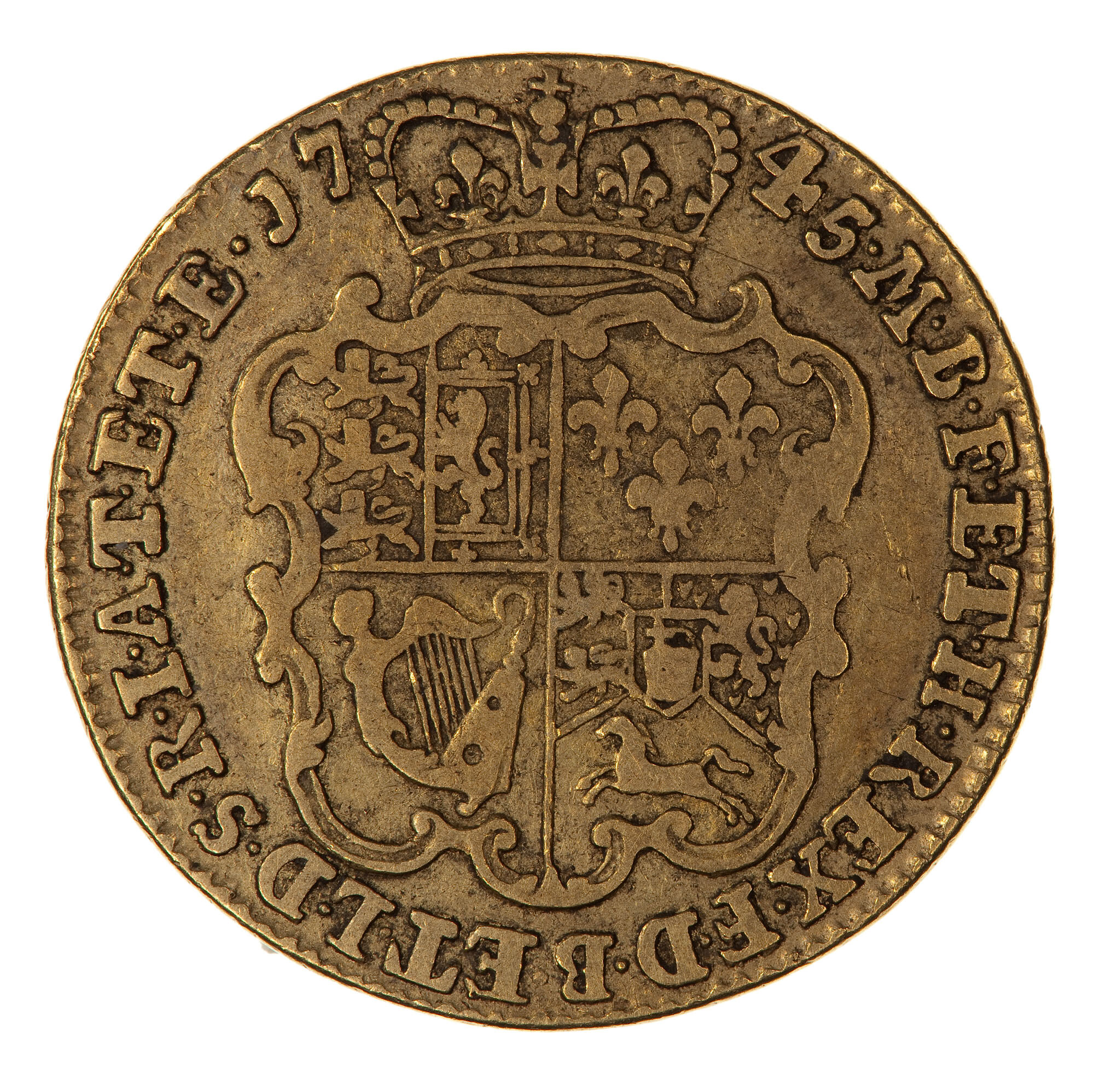 Crowned and garnished shield with the royal arms, England and Scotland impaled, France, Ireland and the Electorate of Brunswick and Luneburg; around, M . B . F . ET . H . REX . F . D . B . ET . L . D . S . R . I . A . T . ET . E . 1745, the date being broken bt the crown. (Translation obverse and reverse: George II by the Grace of God King of Great Britain, France and Ireland, Duke of Brunswick and Luneburg, Archi-Thesaurius and Elector of the Holy Roman Empire).