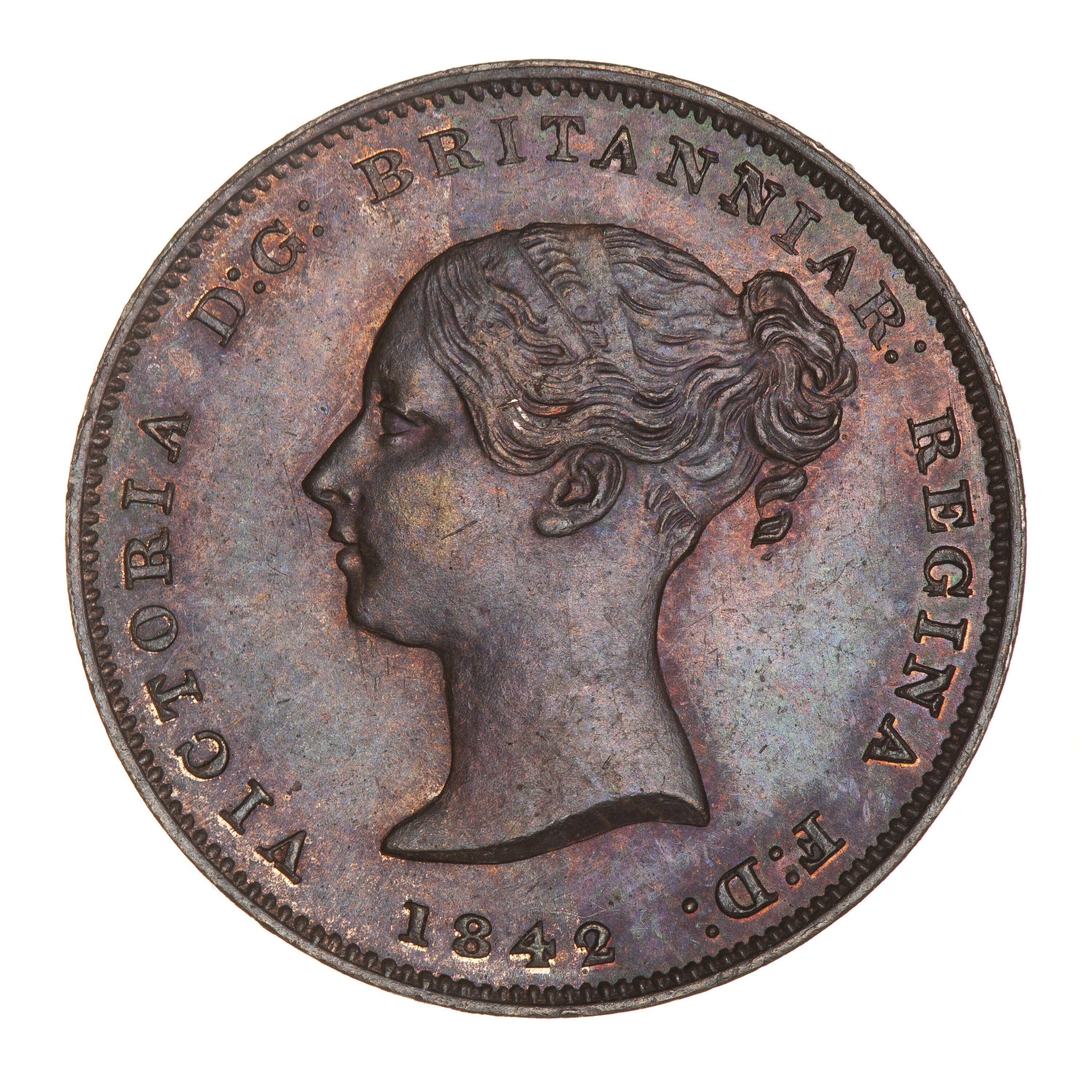 Young head of the Queen facing left wearing ornamented band in her hair; around, VICTORIA D: G: BRITANNIAR: REGINA F: D: 1842