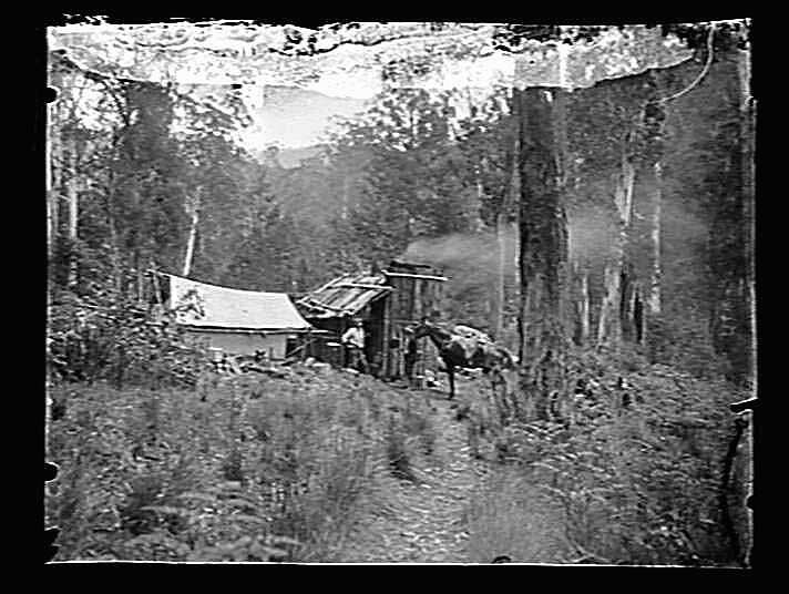Tent, bark hut, horse in forest not Kangaroo Island.