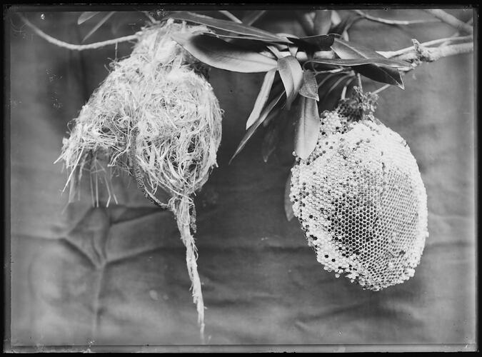 Glass negative of hanging nest and bee honeycomb taken by A.J. Campbell, circa 1900.