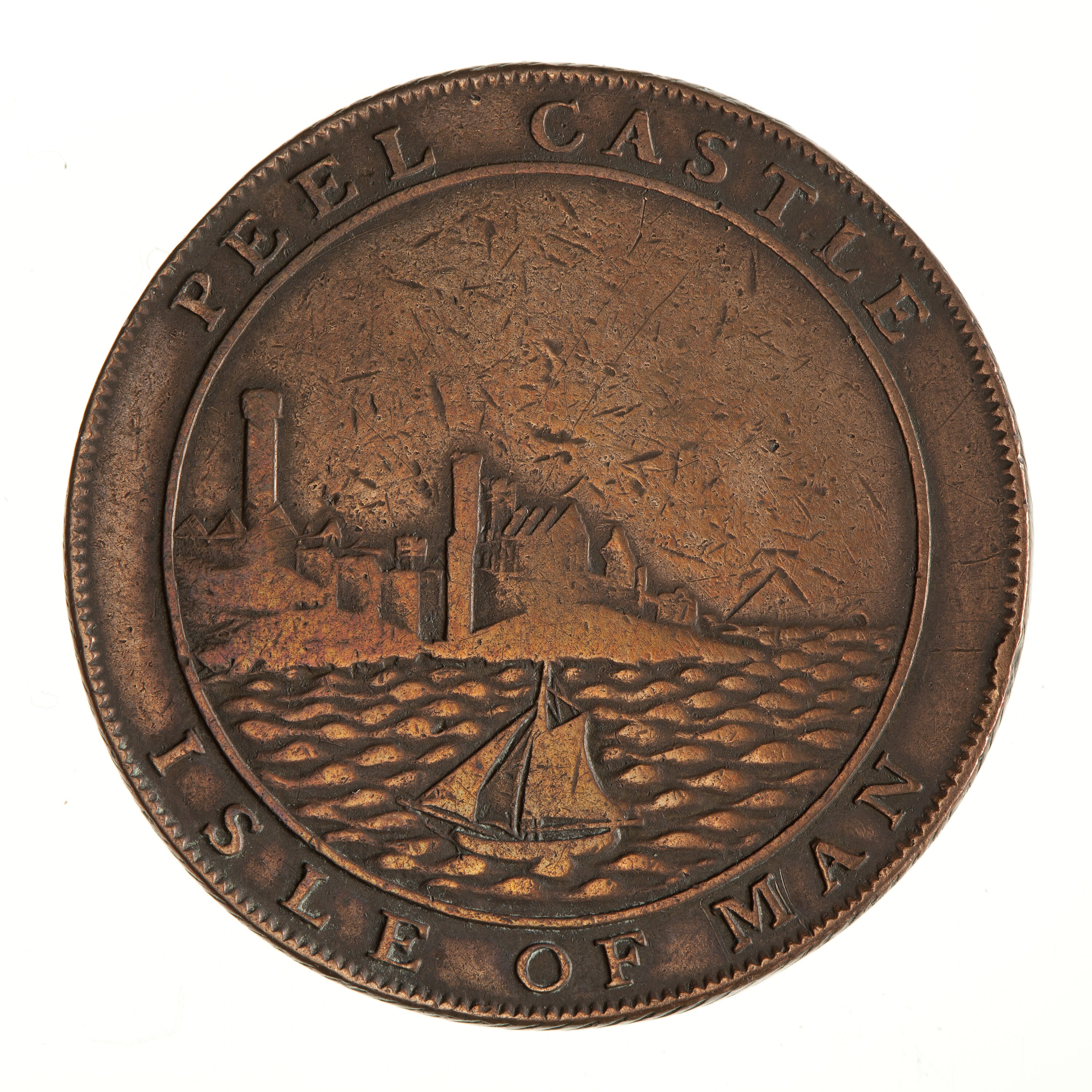 View of Peel Castle from the sea, fishing boat under sail in the foreground. around above, PEEL CASTLE; around below, ISLE OF MAN