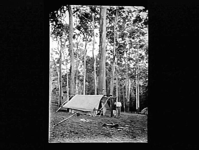 Camp with tent and man in eucalyptus forest.