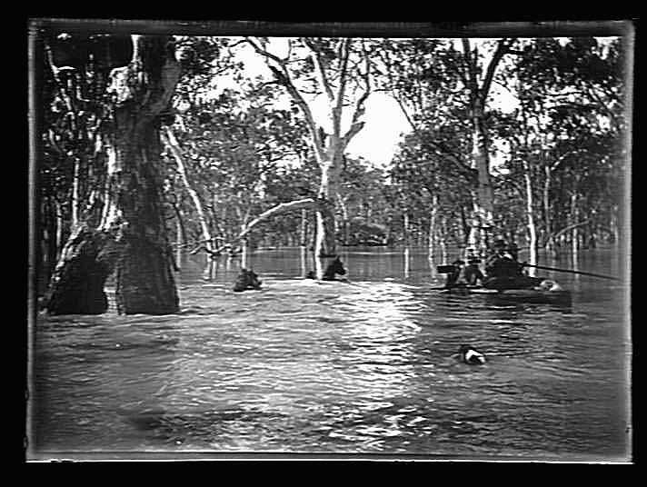 Similar scene to collection no 835 (horses, buggy in flood water, canoe tree on left) but in deeper water.