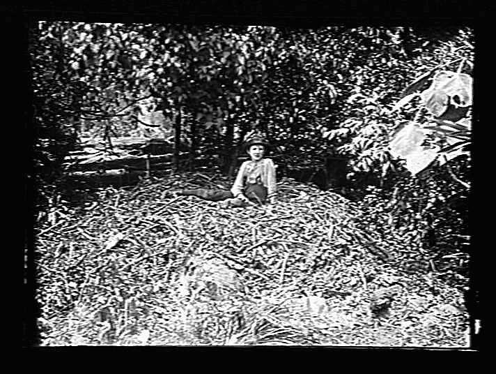 Boy sitting on Megapode nest (scrub-fowl or brush-turkey).