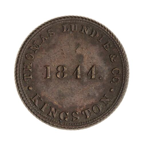 Across centre, 1844; around, THOMAS LUNDIE & Co KINGSTON