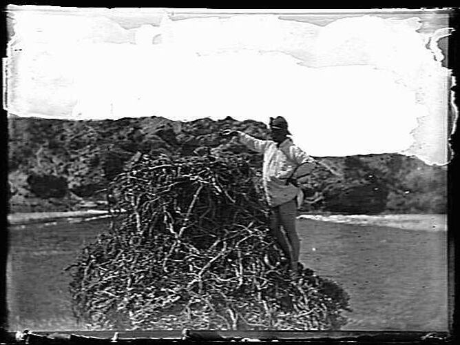 This is the original negative of an image used by Campbell in his work on Australian Birds and Nests. Mr A. J Bussell is holding one of the Osprey's Young. This image was taken a few miles up the coast from Mr. Bussell's home, Wallcliffe in Margaret River, Western Australia. He is wearing only his shirt as they had just waded through the deep water of The Margaret River. He is leaning into the large nest to retrieve the young. As Campbell notes: 'Breathless we reach the aerie, which is only tenanted by fledglings. The camera is quickly adjusted, the tripod resting amongst brittle saltbush, where young gulls were hiding. While Bussell examines the young Ospreys, the drop-shutter descends, and he is immortalised. The illustration give a capital idea of the nest, with the mainland as a background. The nest, with slightly hollowed top, is about 4 feet high, with a circumference of about 13 feet, constructed of sticks and roots, and situated about twenty-five feet above high-water mark.'