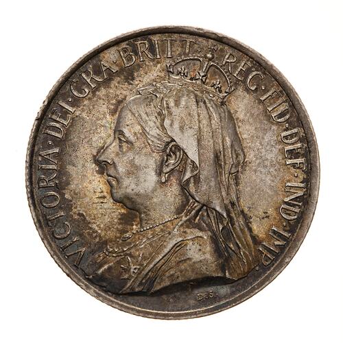 Crowned bust of Victoria left; around, VICTORIA DEI GRA BRITT REG FID DEF IND IMP