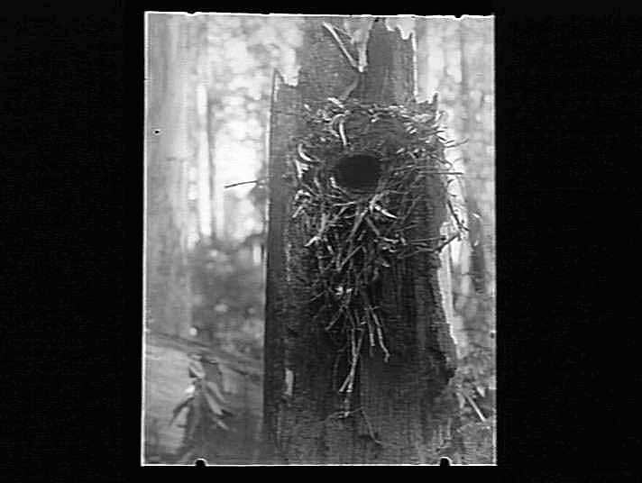 Same nest as Negative No.1472, which was nestlings in nest in top of burnt stump, although no nestlings are visible in this negative.