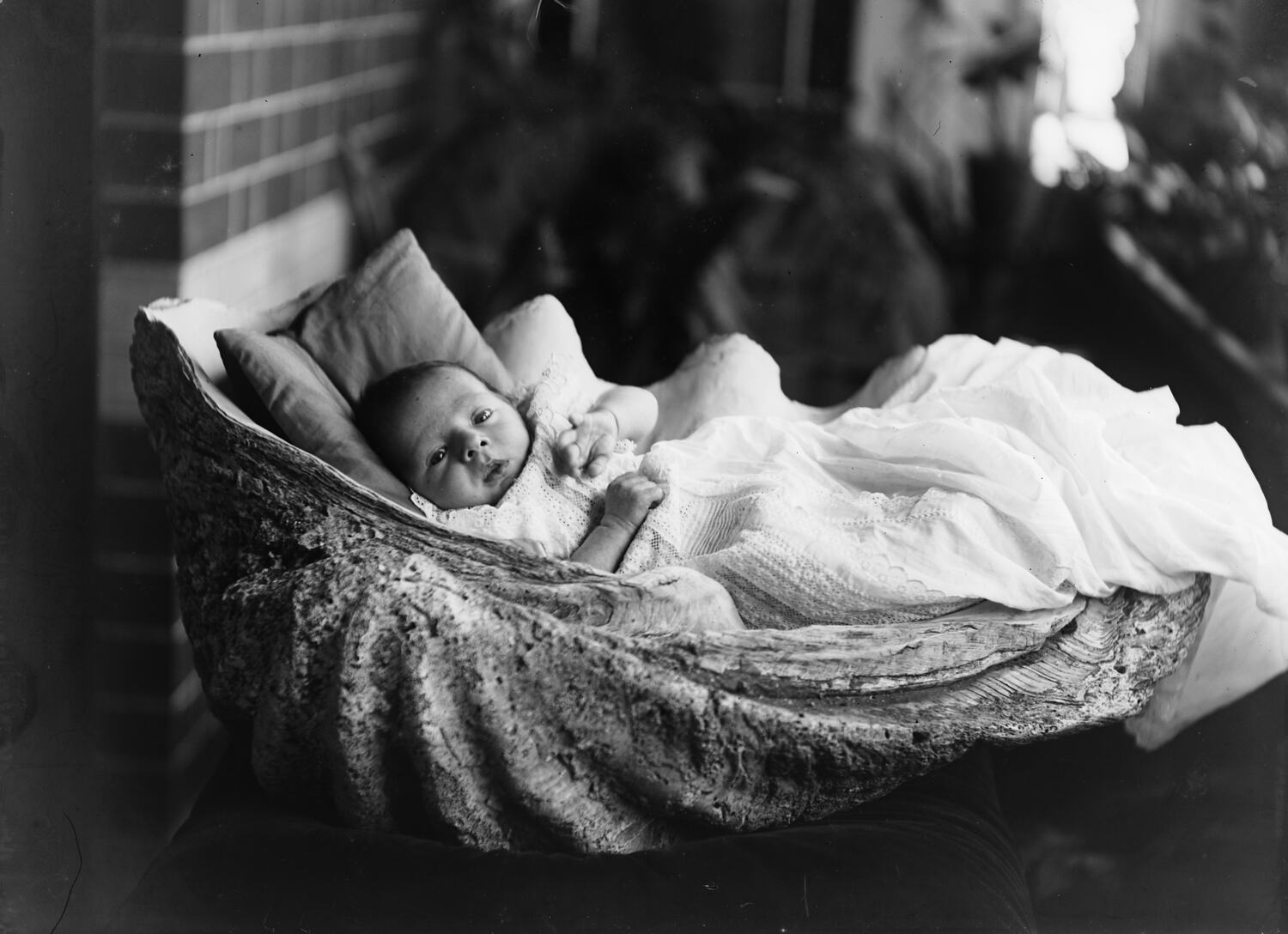 Portrait of Kathleen Beckett in a clam shell, when one day old, 27 May 1892. Kathleen Beckett was born on 26 May 1872 at her home in Westbourne Grove, Northcote, Victoria. Her father Thomas Beckett was the doctor presiding at the birth, and he took the photo the following day.
