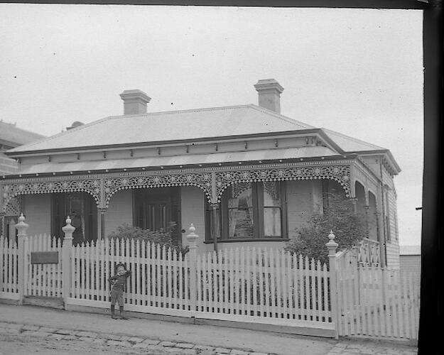 Beckett family home at 91 Westbourne Grove, Northcote, circa 1893. George Beckett, about 9 years old, stands at the front fence. The Beckett family moved in the house in early 1892 and moved to High Street, Northcote in 1895.
