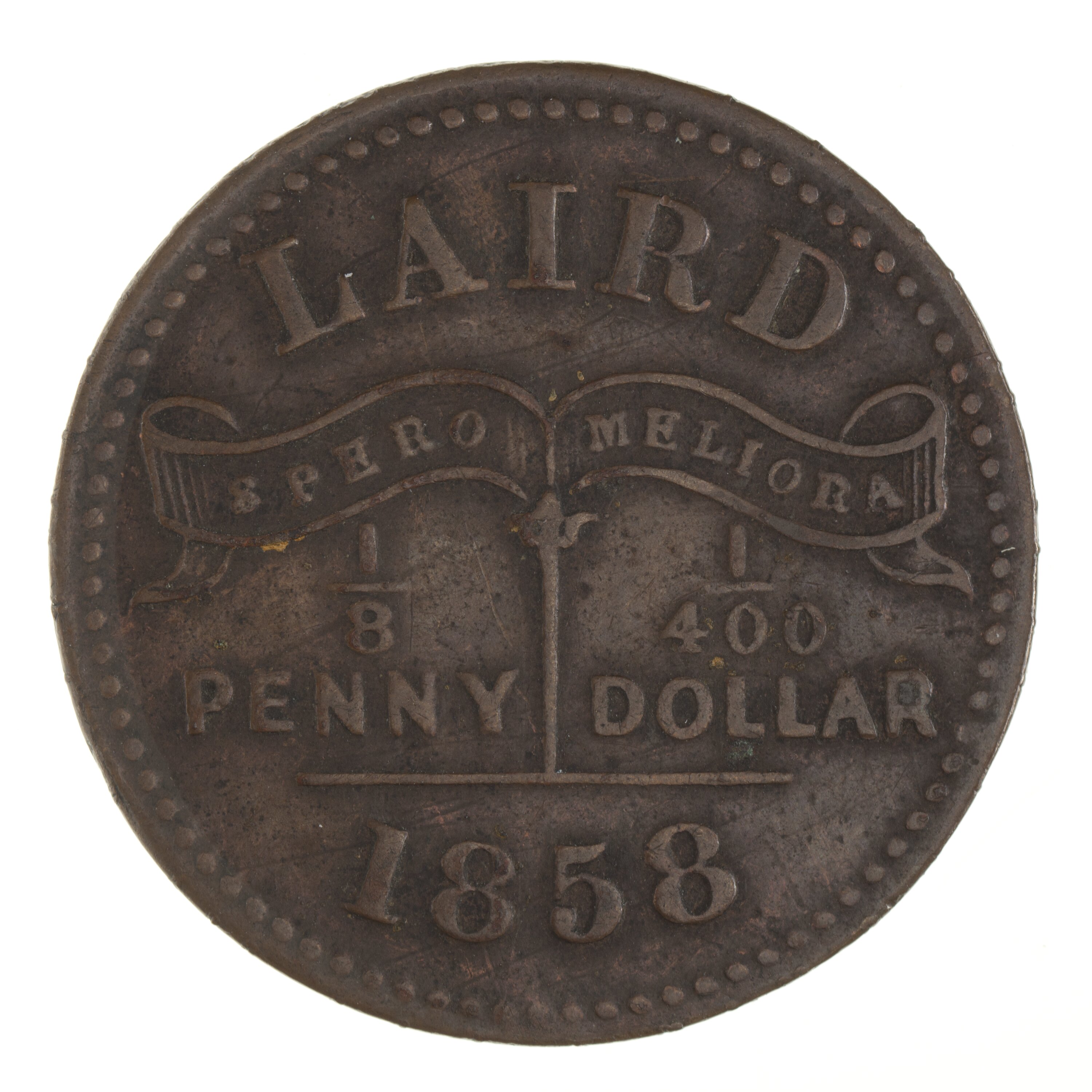 Legend in five lines; at top, LIARD, on ribbon SPERO MELIORA (translation: I hope for better things); divided by centre pillar, 1/8 / PENNY 1/400 DOLLAR; at bottom, 1858