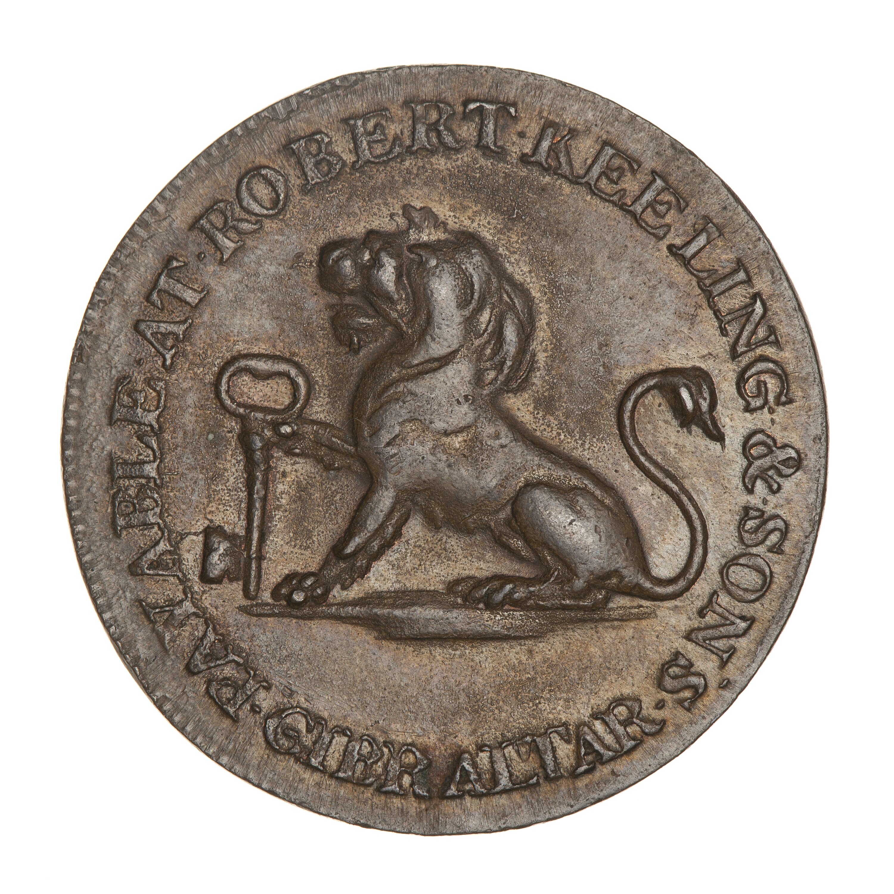 Lion seated facing left holding a key in its right paw; around above, PAYABLE AT ROBERT KEELING & SON'S; below, GIBRALTAR