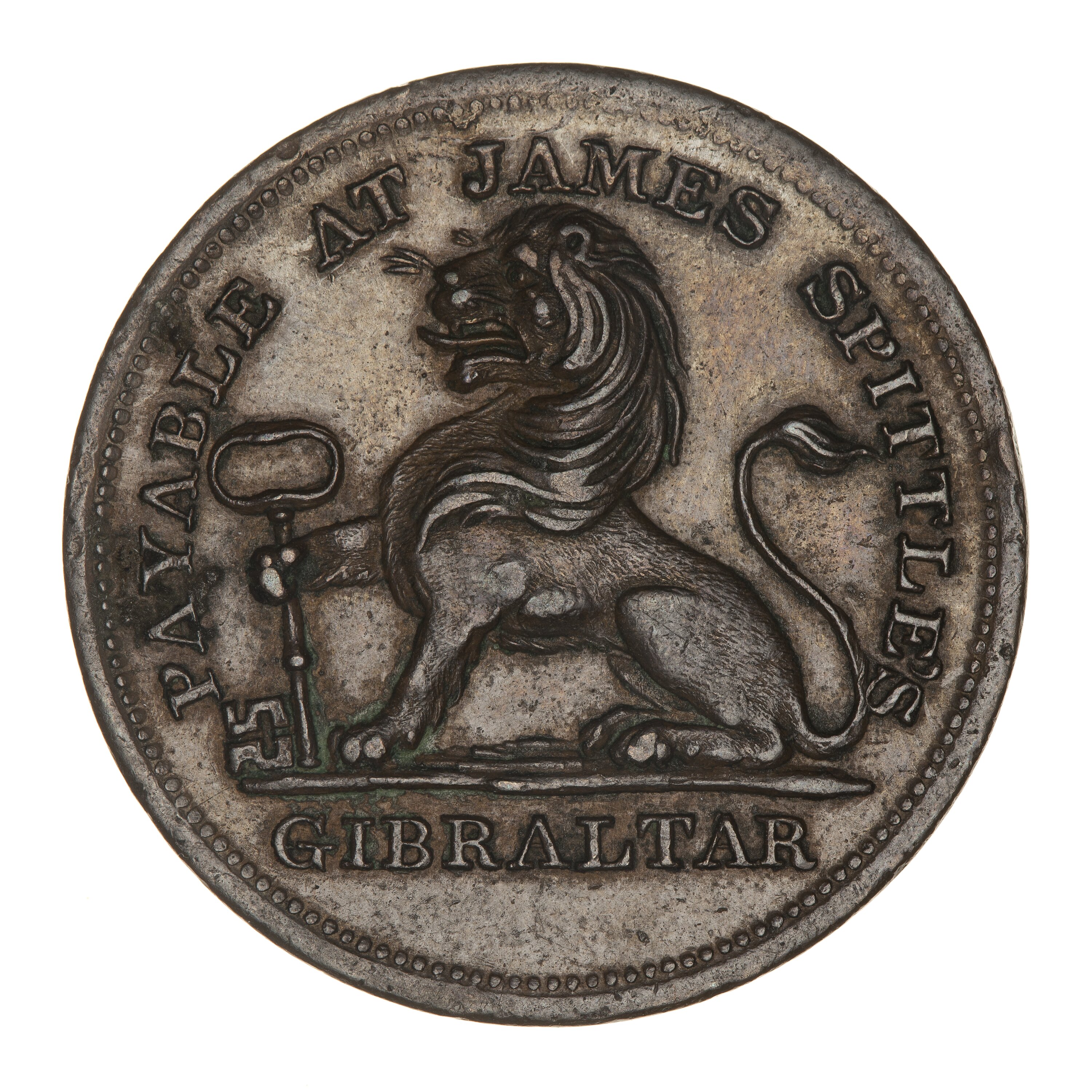 Lion seated facing left holding a key in its right paw; around above, PAYABLE AT JAMES SPITTLE'S; below, GIBRALTAR
