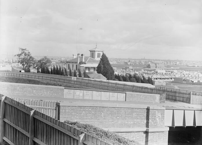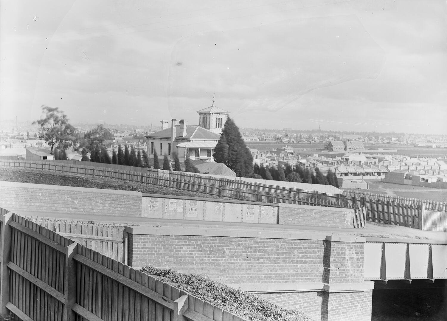 This description is obviously incorrect . The image is reversed. The photograph is taken from the veranda of 91 Westbourne Grove and shows a railway bridge in the foreground . An advertisement for J.Stevens regarding a brick cottage for sale in Railway St.