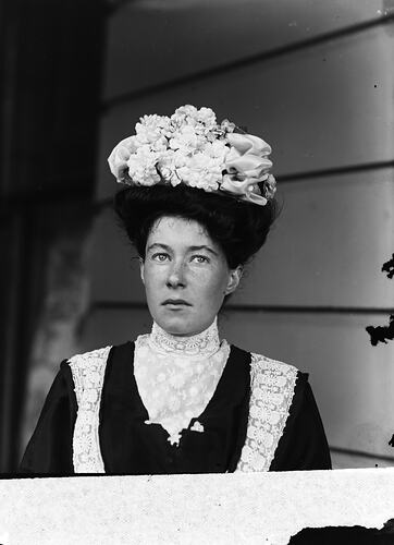 Kate Beckett wearing her new hat, on the porch of 'Chelmer', the family residence of Kate's parents-in-law Thomas & Kate Beckett, in St Kilda Road, South Yarra, 12 July 1908. Photograph taken by Thomas Beckett.