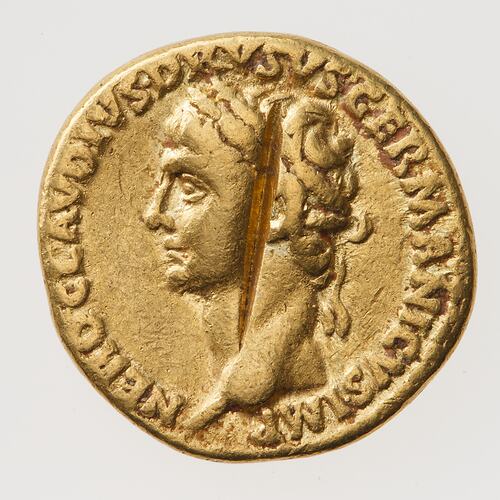 Gold Aureus struck by Claudius in the name of Nero Claudius Drusus the Elder, 41-45 AD.